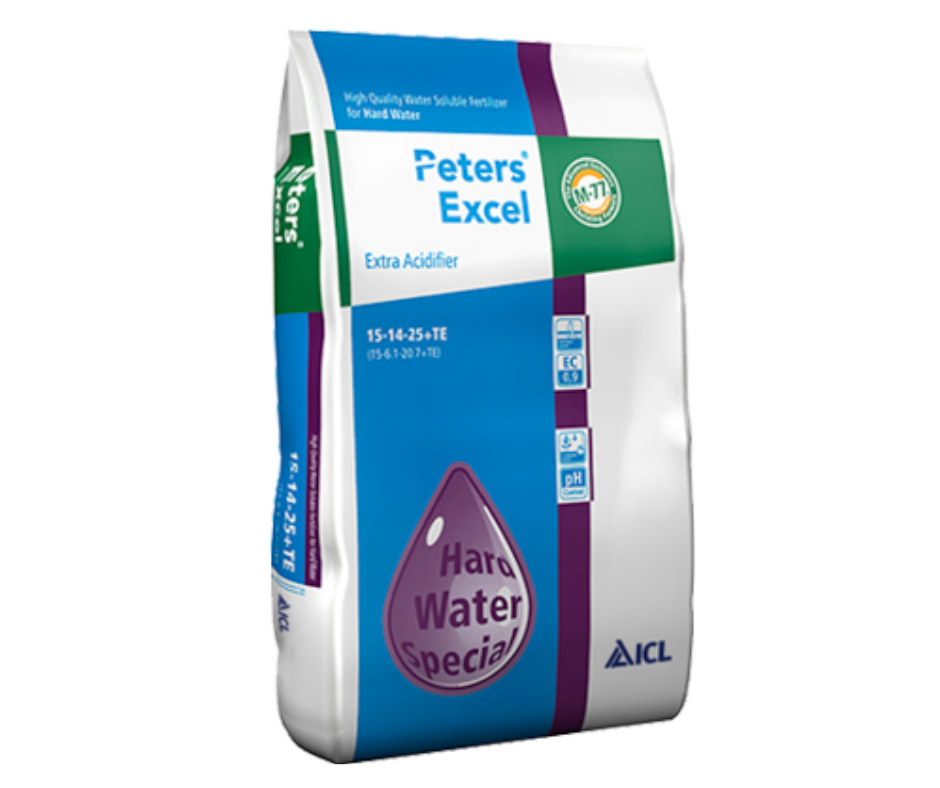Peters Excel Extra Acidifier 15-14-25+MgO+ME este un îngrășământ hidrosolubil profesional, dezvoltat de ICL Specialty Fertilizers, special formulat pentru culturile irigate cu apă dură sau foarte dură, unde este necesară o acidifiere suplimentară a soluției nutritive. Produsul asigură o nutriție completă și echilibrată, contribuind la stabilizarea pH-ului și la absorbția optimă a nutrienților.